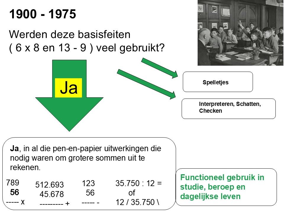 Voor het uitvoeren van deze algoritmen waren die formele rijtjes van de hier genoemde basisset, specifiek in deze uitrekenvorm, een handige onderlegger. Kortom de ééndimensionale opvatting over “arithmetical fluency” was in de periode voor 1975 consistent met heel veel van het dagelijkse handelen op het gebied van vooral uitrekenen. Het verder toepassen of gebruiken om problemen uit het echte leven te mathematiseren en op te lossen schoot daarbij in. Onderwijstijd was en is uiteindelijk beperkt.